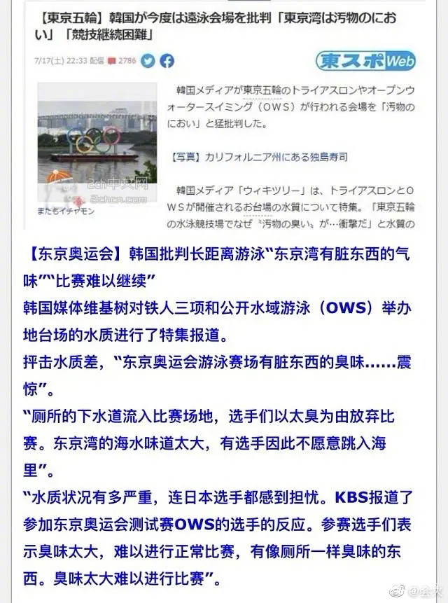東京奧運會鐵人三項比賽場地大腸桿菌嚴重超標,選手集體嘔吐_風聞