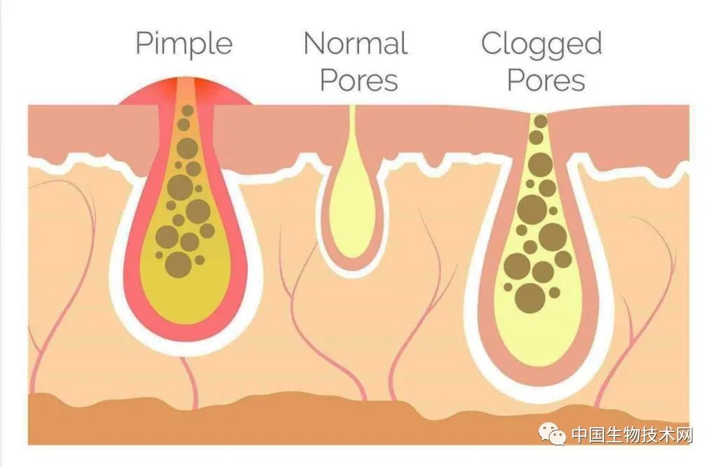 2、導管角質形成細胞彼此分離不完全,導致凋亡受損和隨後毛囊皮脂腺管阻塞;