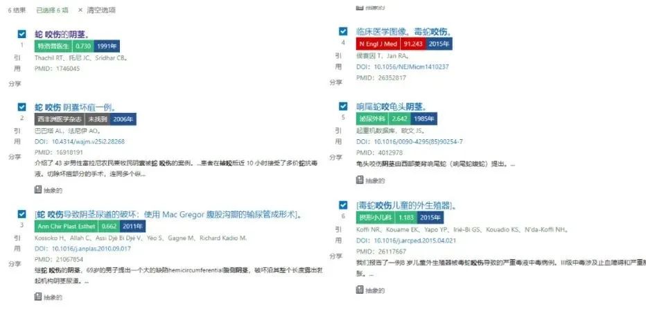 懷疑圖是假的?來,咱們再學術一點,在Pubmed上檢索“Penis”,“Snake bite”,一共有6條檢索結果: