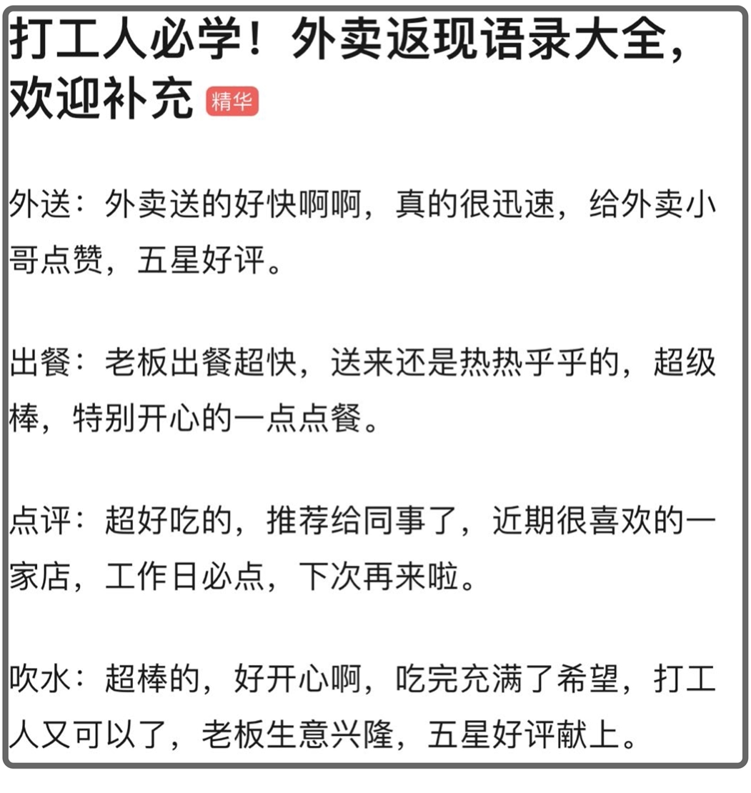 堅持好評返現3個月後,rose已經着手讓公司程序員開發外賣好評自動生成器了,生動展現了有錢人的格局。