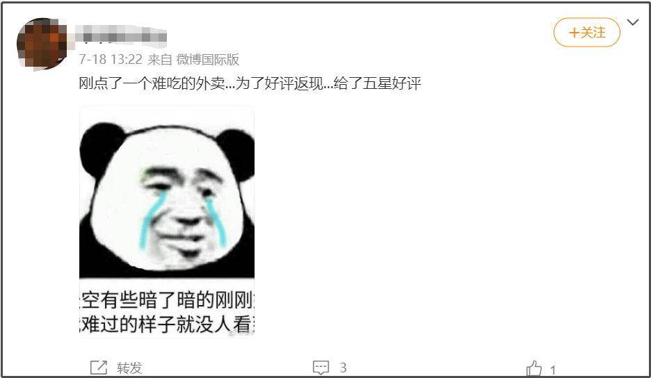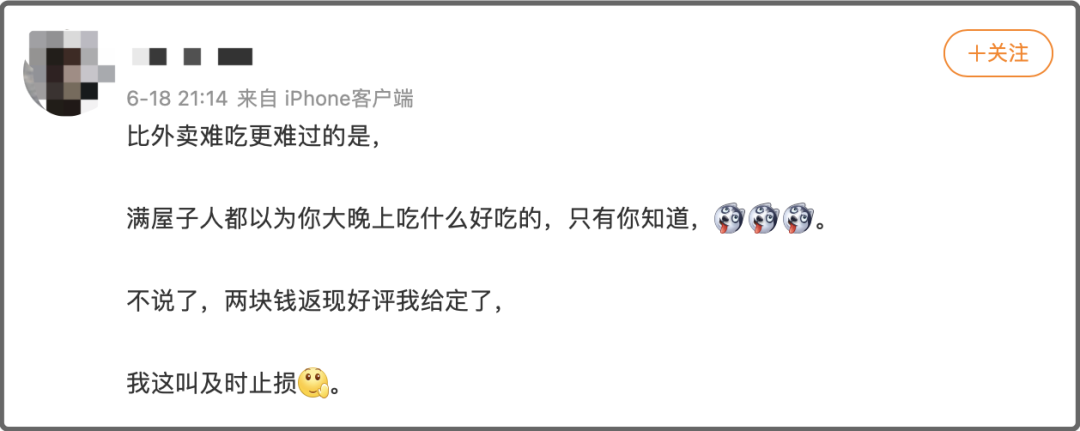 當然也有人抱着止損的想法,含淚給難吃外賣寫下好評。