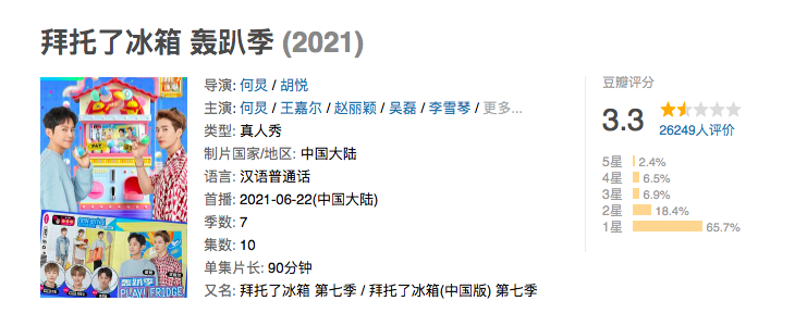作為曾經的下飯綜藝“天花板”,《拜託了冰箱 轟趴季》前兩期的豆瓣評分只有2.9分,這是很多觀眾始料未及的,雖然第三期節目後口碑稍顯回升,也僅上升到了3.3分,點開豆瓣評論區,一星差評率高達65.7%。