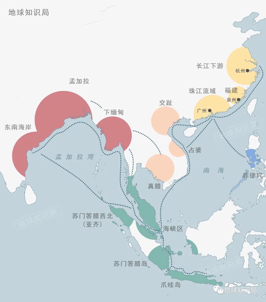 在當時的泉州與南洋之間共有三條主要航路,分別為:泉州至交趾、占城、真臘航路;泉州至三佛齊、闍婆、渤泥等國航路;泉州至菲律賓航路。當然,還可以通向更遠,更加長途的貿易則多以短途貿易相互接力來實現。