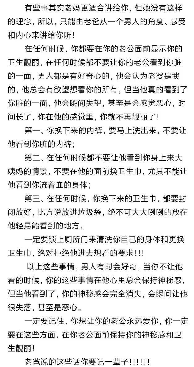 一位網友在網上投稿了自己爸爸在結婚前發來的一篇長文,聲稱站在男人的角度、感受和內心講的心裏話。