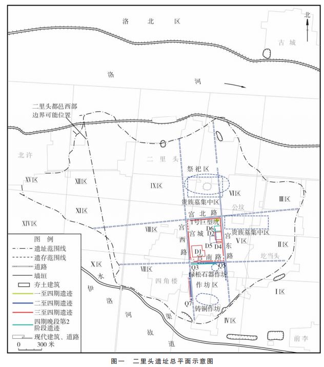 目前二里頭遺址內發現的鑄銅遺存主要集中於二里頭遺址的Ⅳ區和Ⅴ區,也就是圍垣作坊區和宮殿區。圍垣作坊區南部發現有較大範圍的青銅器澆鑄工場、陶範燒烘工房和陶窯,熔鍊銅料的坩堝、陶範、熔爐碎片、銅礦石、木炭、銅渣等,因此該處存在一處鑄銅作坊應當是確鑿無疑的。圍垣作坊區內的鑄銅作坊在20世紀60年代至80年代就進行過發掘,揭露面積近3000平方米,根據發掘與勘探結果推測其總面積在1.5萬到2萬平方米,主要使用時間為二里頭文化二期早段至四期晚段。在二里頭宮殿區雖發現有部分銅渣、銅礦石等冶煉遺物,但一直未尋找到冶鑄相關的遺蹟,因而暫無法判斷該區域是否存在鑄銅作坊。