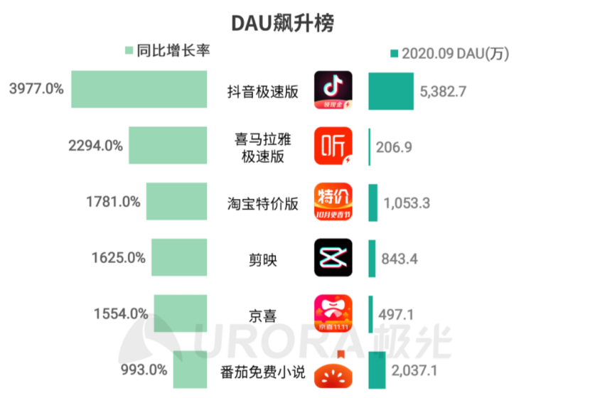 極光數據相關報告顯示,移動互聯網派生app發展迅速,2019年9月到2020年9月,抖音極速版等5款派生APP進入到季度內DAU飆升榜TOP 10。到2020年6月,極速版app覆蓋滲透率達到42.9%,三年半時間增長近30倍。其中,老年用户佔比較高,抖音極速版中46歲以上用户佔比為14.8%,快手極速版中46歲以上的用户佔比為12.4%。