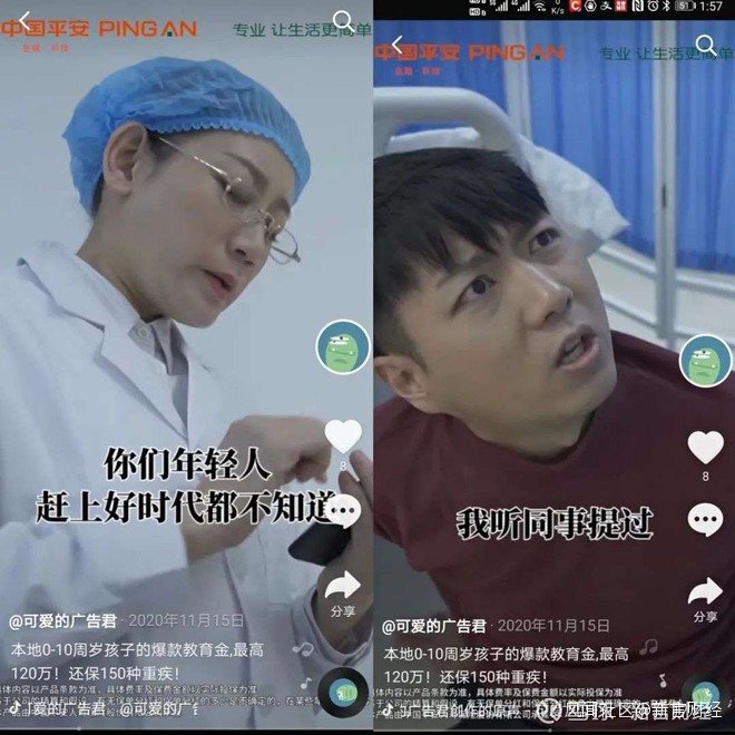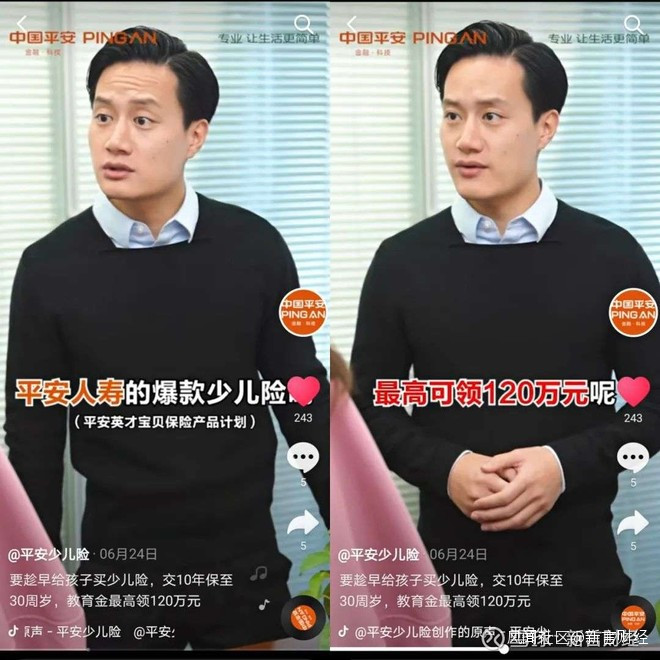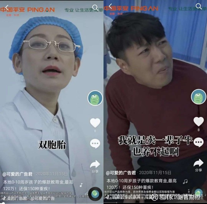 或許是被大數據發現了什麼,近日《新言財經》在抖音App中頻繁刷到少兒保險廣告。在一則短視頻廣告中,一個男子在產房外聽到醫生説妻子生了雙胞胎男孩,如遭雷擊,跌倒在地“倆男娃娃,我就是賣一輩子牛也養不起啊。”