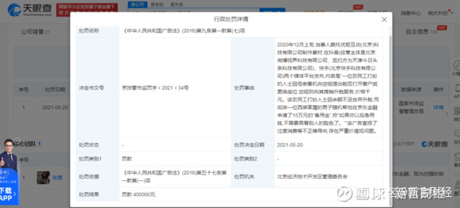天眼查App顯示,近日,京東金融關聯公司北京方博資元信息科技有限公司又因該廣告遭受行政處罰,處罰事由為發佈的廣告宣揚了過度消費等不正確導向,存在嚴重價值觀問題,處罰結果為罰款40萬元。
