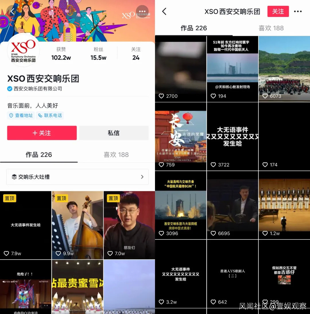 為了更好俯就用户,西安交響樂團先後開通B站和抖音賬號,並開始做精細化運營路線。而之所以選擇這兩個平台,西安交響樂團也有自己的考量,整體思路是“抖音打面,B站耕耘年輕用户”。