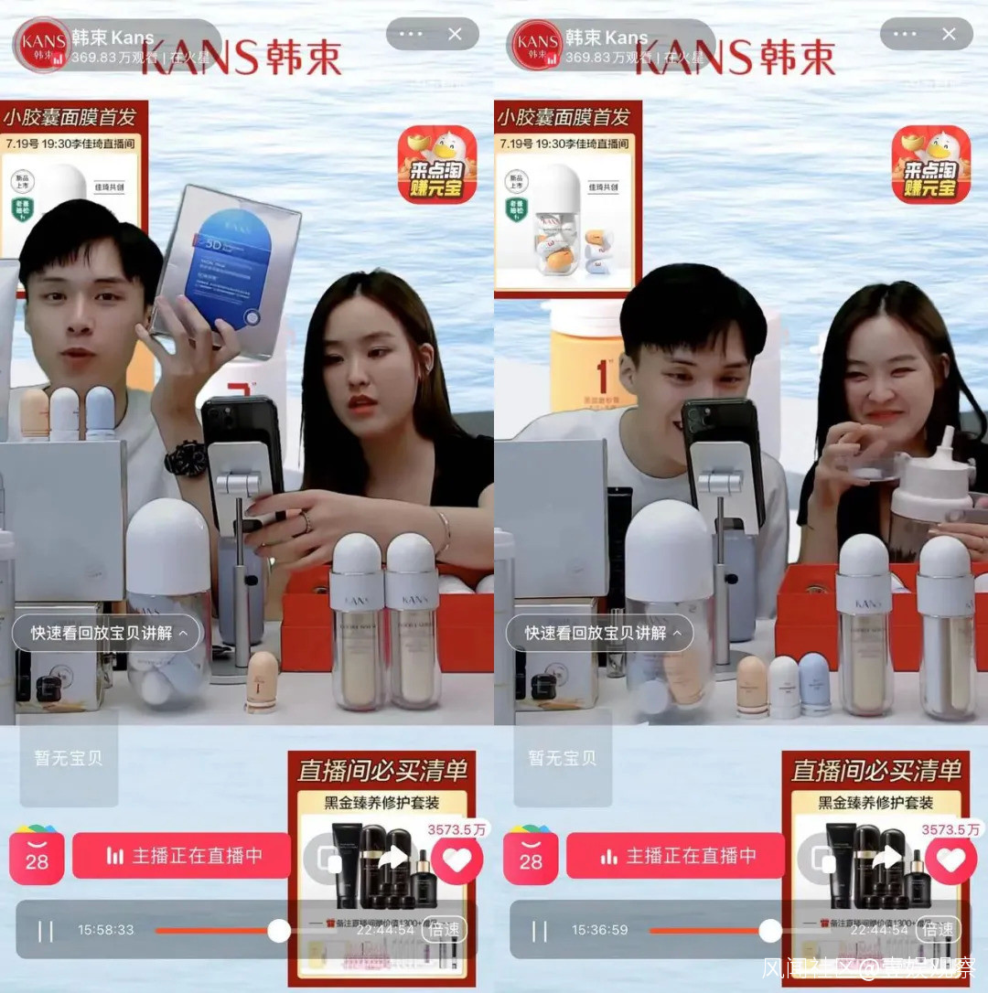 首先,品牌自播商品更加統一,不會加入其他品牌,因此也不會擔心主播介紹的時候顧此失彼;其次,品牌直播間的人格化表現更加明顯,比如“韓束夫婦”,消費者對品牌的認知不再限於冰冷的logo,而是形成了基於主播魅力的喜好。