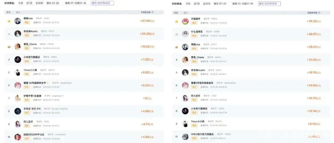 據觀察,相比7月18日近370萬的巔峯場觀,隨後幾場的場觀數據回落到100萬左右,而最近一場“韓束夫婦”缺席的場觀數據已經下滑到19.6萬,僅達到巔峯時刻的5%左右。