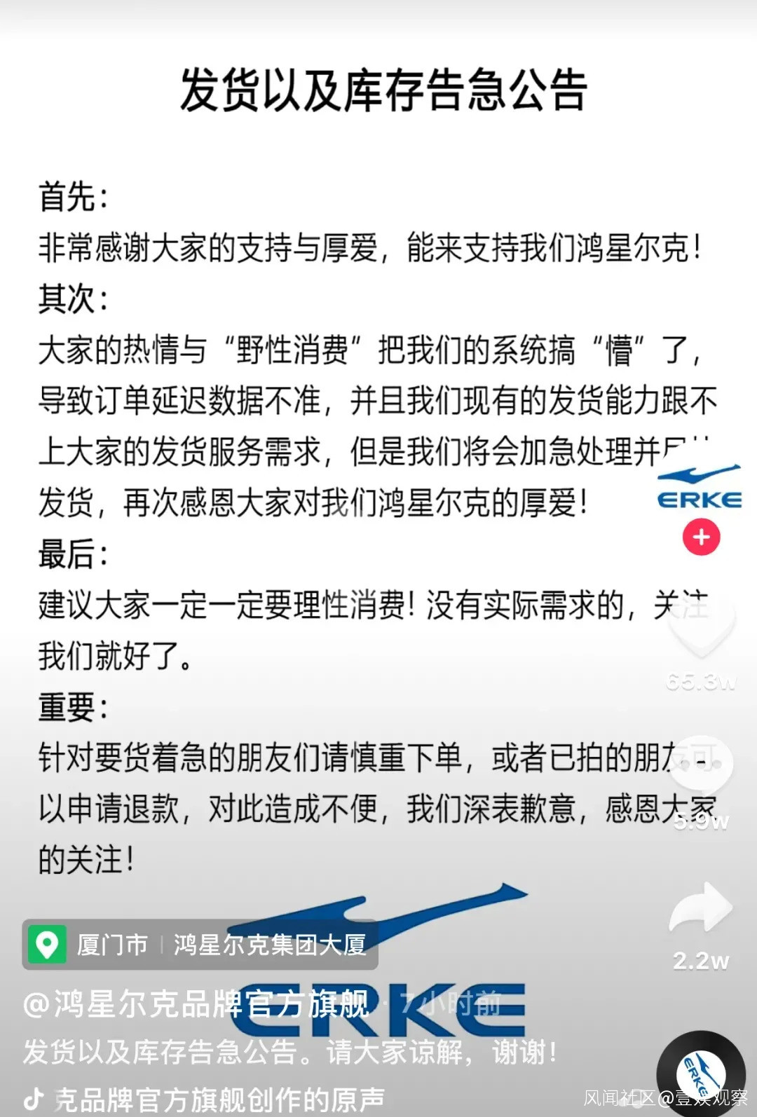 繼韓束之後,鴻星爾克品牌直播間再次被網友“衝爆”。