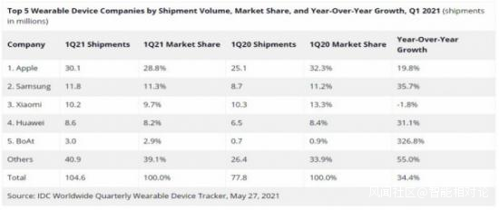 根據IDC公佈的2021年第一季度市場數據來看,目前蘋果依舊是智能手錶領域的領頭羊,佔據全球30%以上的份額,遠超三星、華為等品牌。但目前國產品牌也有相當的起色,小米排行第三佔據了10.2%的市場份額,華為則排行第四,佔據了8.65%的市場份額。