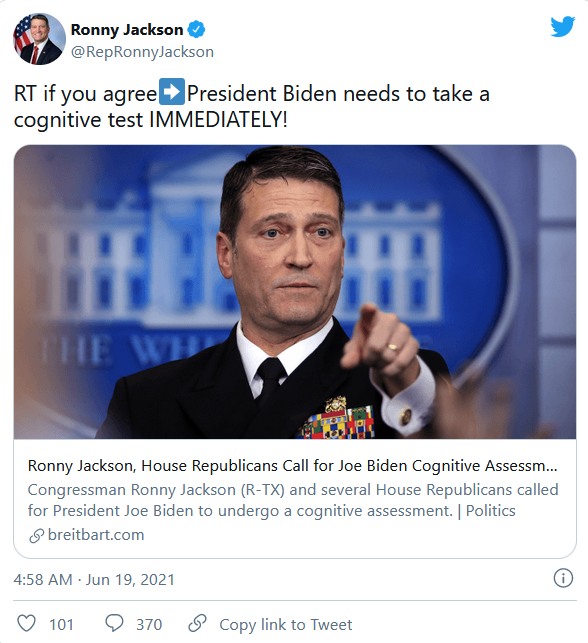 他説,拜登現在遇到了一些嚴重的事情。傑克遜認為,要麼拜登會主動辭職,要麼白宮會説服他在不久將來的某個時候因為身體狀況而辭職,要麼國會之後會不得不使用第25修正案來擺脱拜登。傑克遜是前總統特朗普和奧巴馬的白宮醫生,他曾在6月份公開發表一份倡議信,呼籲拜登進行認知測試,以證明他在精神上適合履行總統職責。該信由十多名共和黨人簽署。