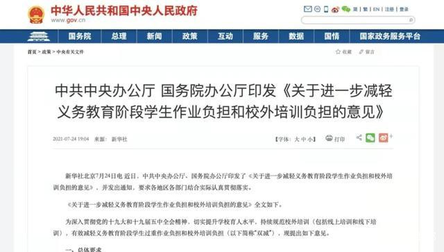 近日,中共中央辦公廳、國務院辦公廳印發了《關於進一步減輕義務教育階段學生作業負擔和校外培訓負擔的意見》(以下簡稱為《意見》或“雙減”政策),該《意見》提出包括: