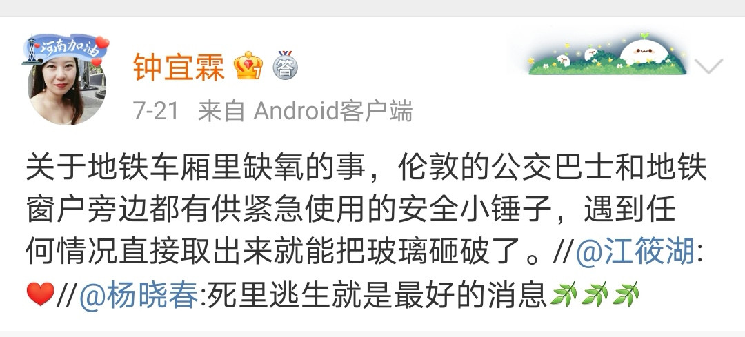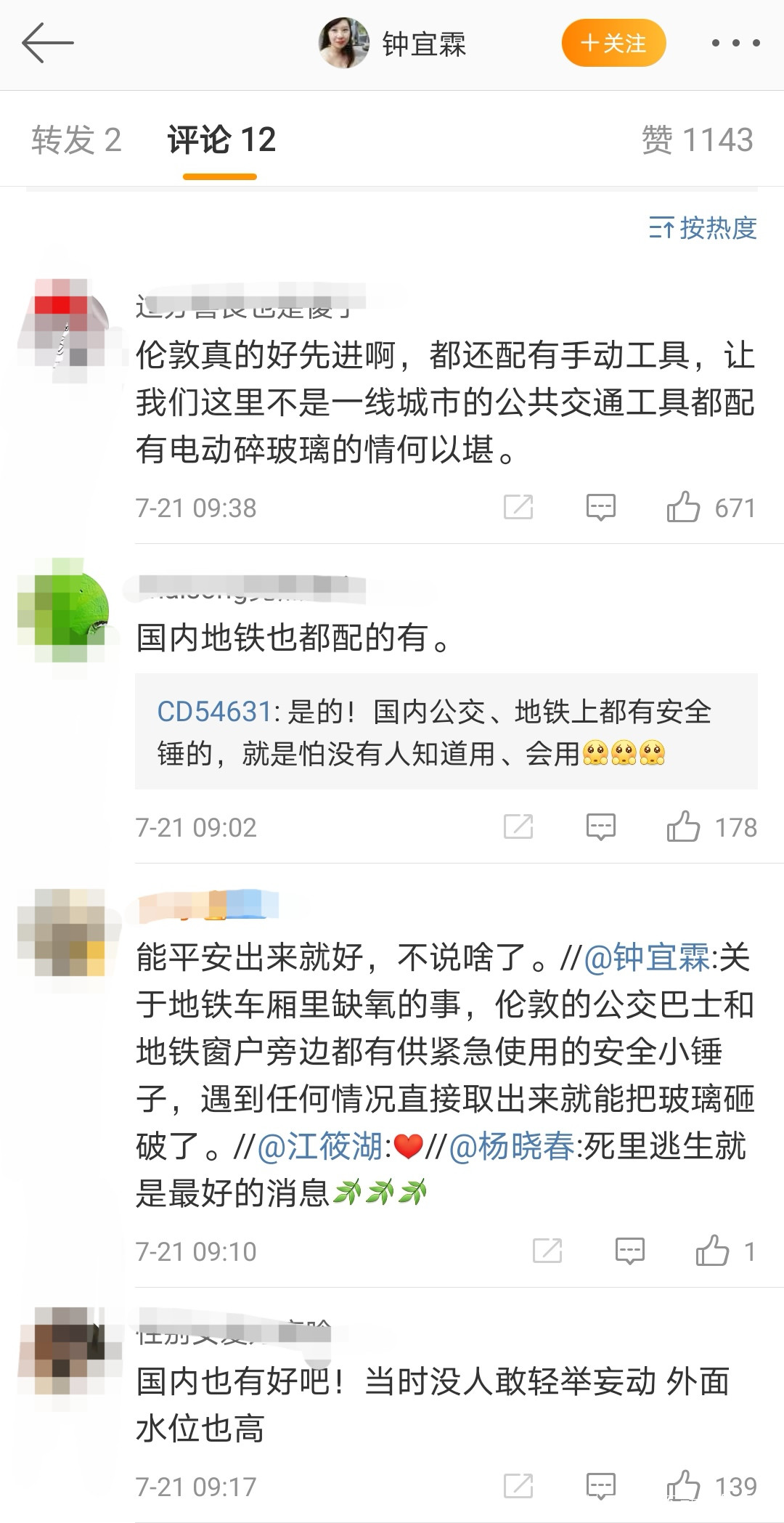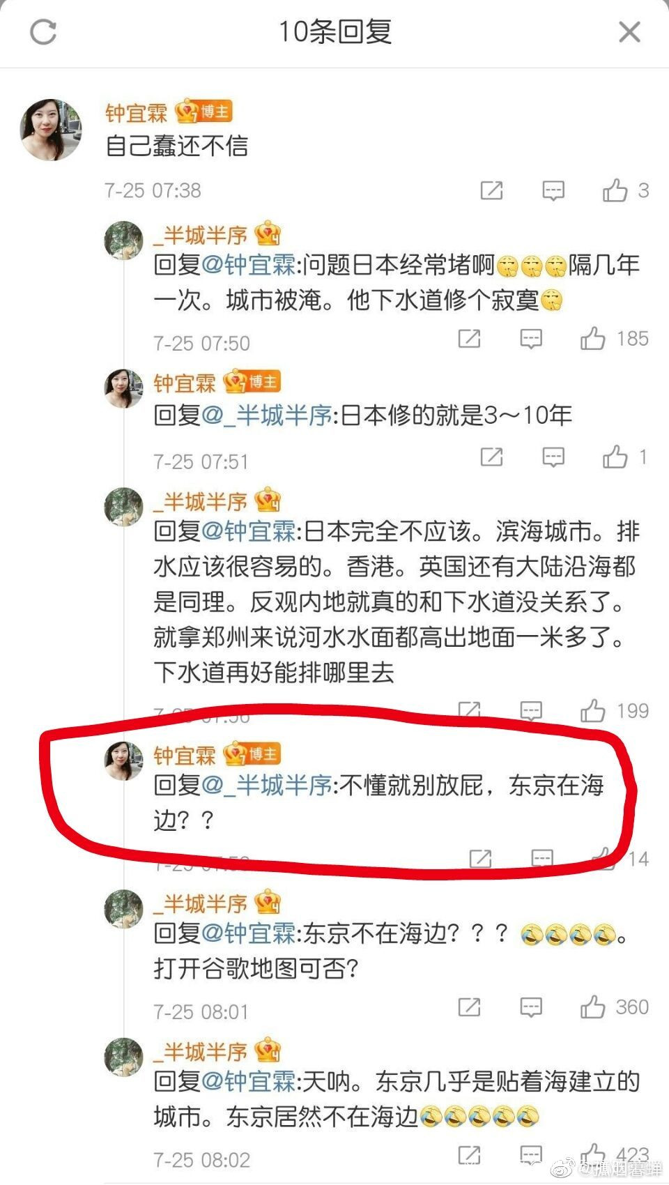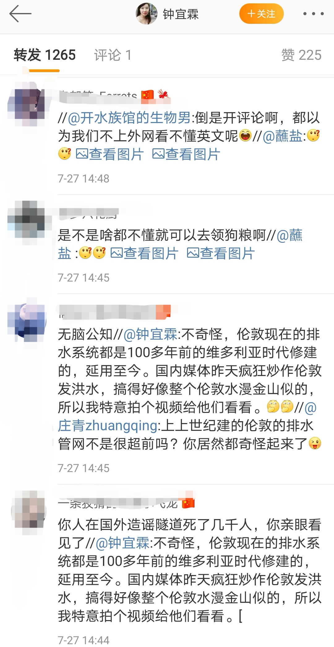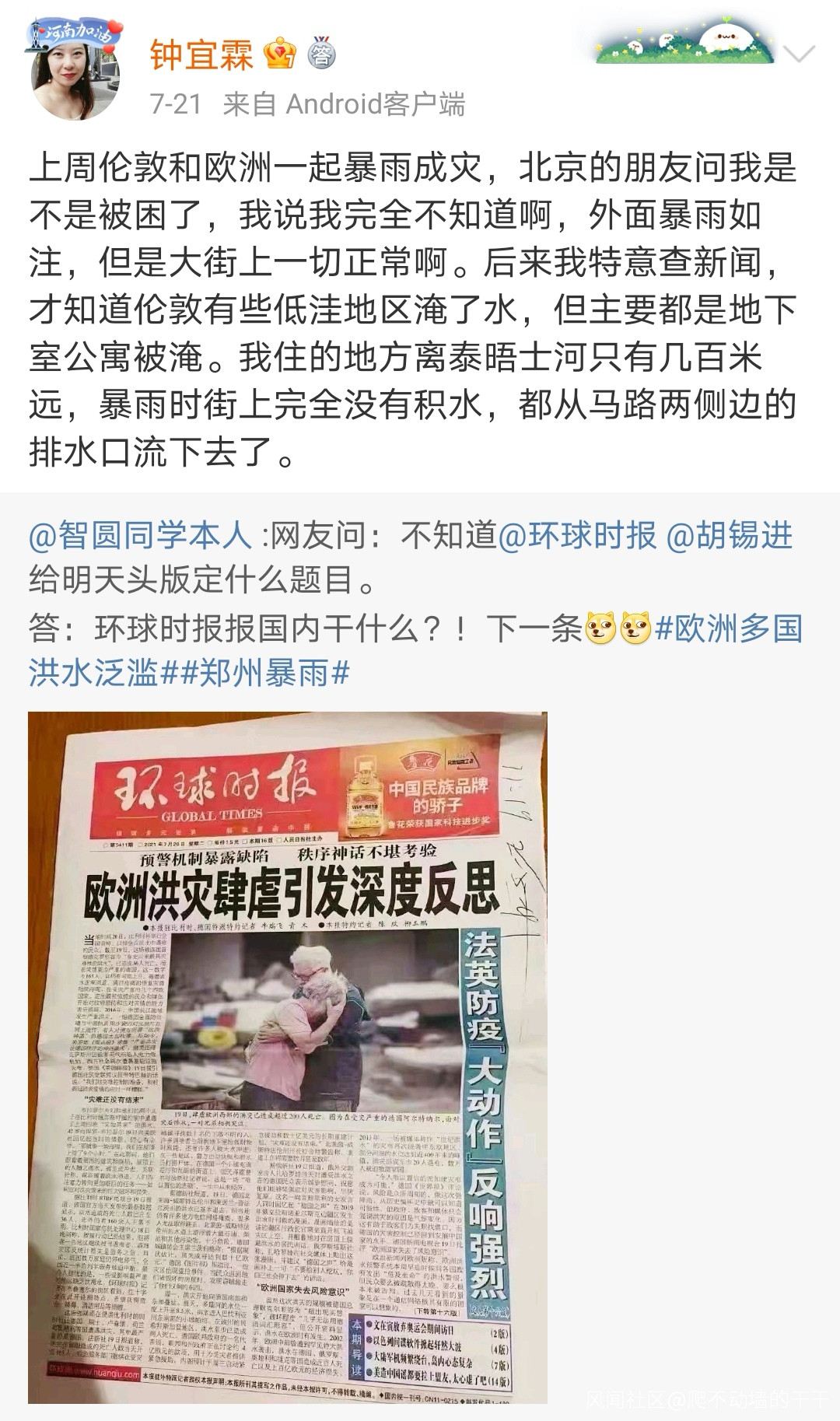 7月21日,當網友們都在為河南災情揪心時,鍾宜霖直接發帖造謠鄭州京廣隧道里,有4000多人被困(隨後該貼被她刪除),並拿出前一週英國與歐洲一起暴雨成災的新聞對比,明嘲暗諷鄭州城市排水系統的落後。