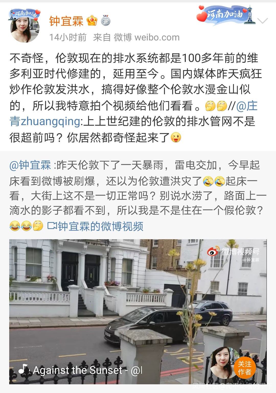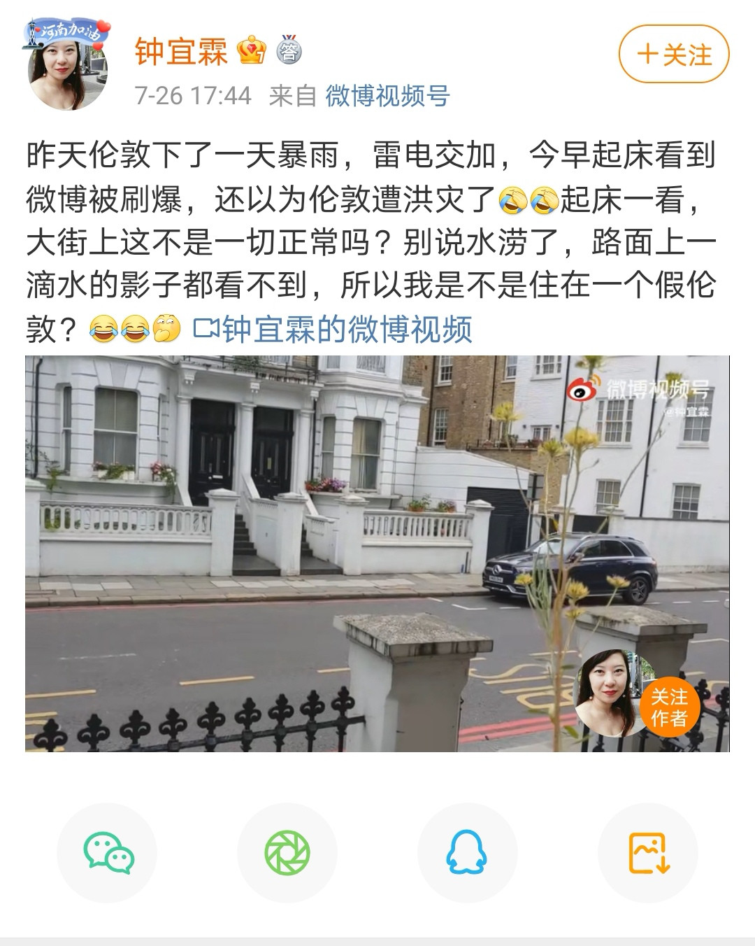 眼看理虧,鍾宜霖並不死心,26日她拍攝了一段倫敦家門口的視頻,並配文:“還以為倫敦遭洪災了,起牀一看,大街上這不一切正常嗎?所以我是不是住在一個假倫敦?”