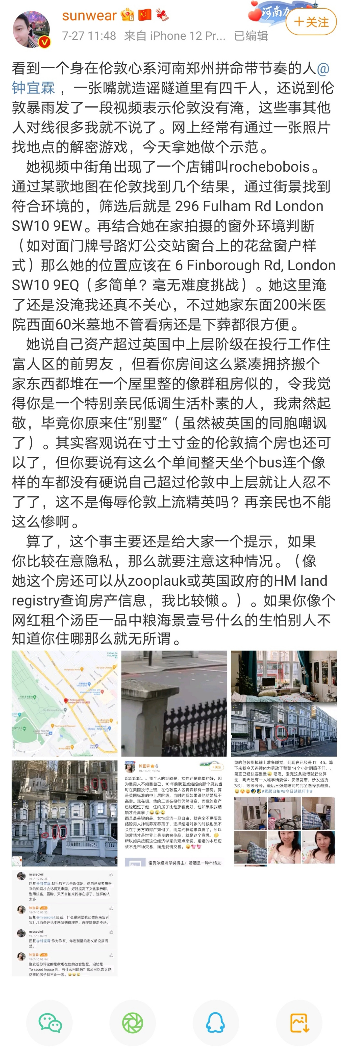 更有網友發動了自己的“偵察”能力,通過鍾宜霖之前的發帖,定位了其倫敦住址,直接打臉她之前營造的“英國中上層階級移民”人設,換來網友們的連聲叫好。