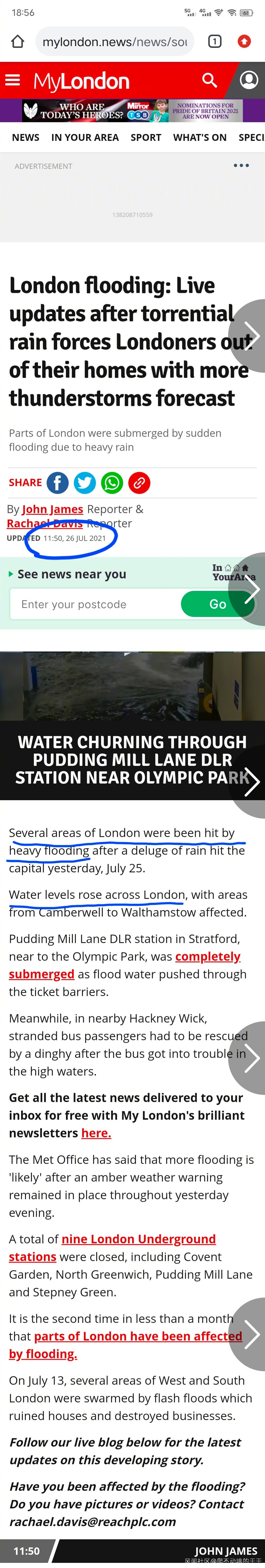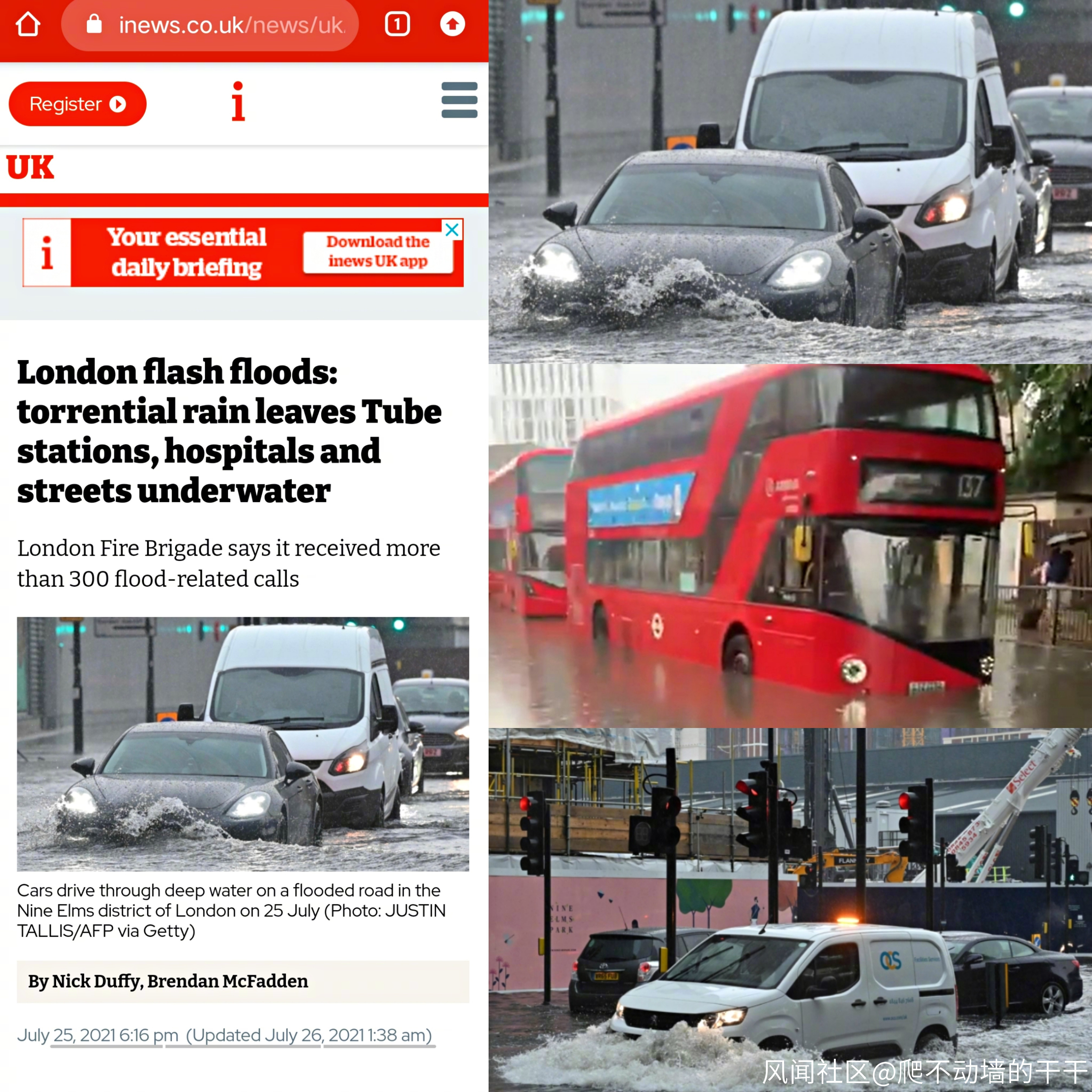 (網友貼出的英國當地報道中説明了倫敦連續遭遇雷雨襲擊,道路被淹沒,公交車等車輛被困在洪水中)