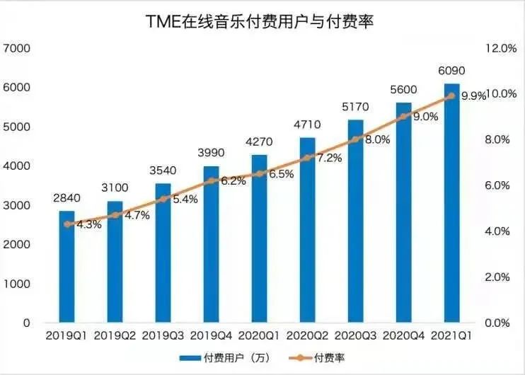 以騰訊音樂為例,財報顯示,2021年Q1,騰訊在線音樂MAU (月活) 為6.15億,付費用户由同期的4200萬增長至6090萬,付費率達9.9%,要知道,在2016年,其付費率僅為2.1%。而在2018年,中國數字音樂平台用户付費率也僅為5.3%。