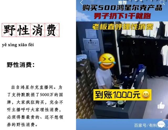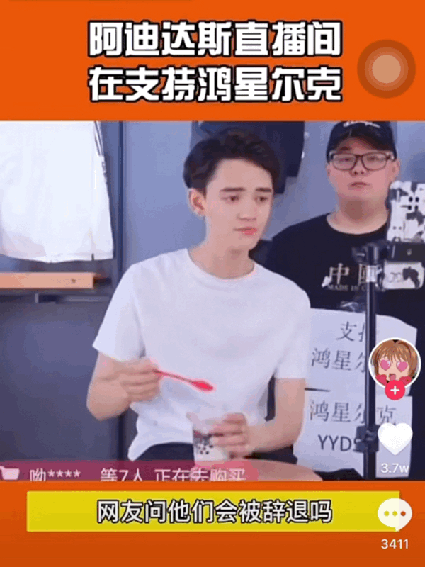 也有聰明的(不得不識相一點),比如adidas直播間,兩個主播穿一身鴻星爾克,舉着“鴻星爾克yyds”,還説“我們已經辭職,我們要去鴻星爾克求職”……