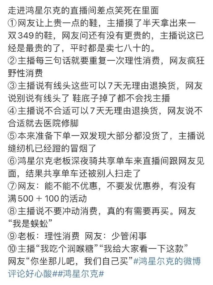 比如這一次鴻星爾克的一個善意之舉,倒成了某些人的武器。 熟悉的套路, 一如既往的 莫名其妙。 鴻星爾克的同類品牌/競品, 直播間主播 很多 都被罵了一晚上。