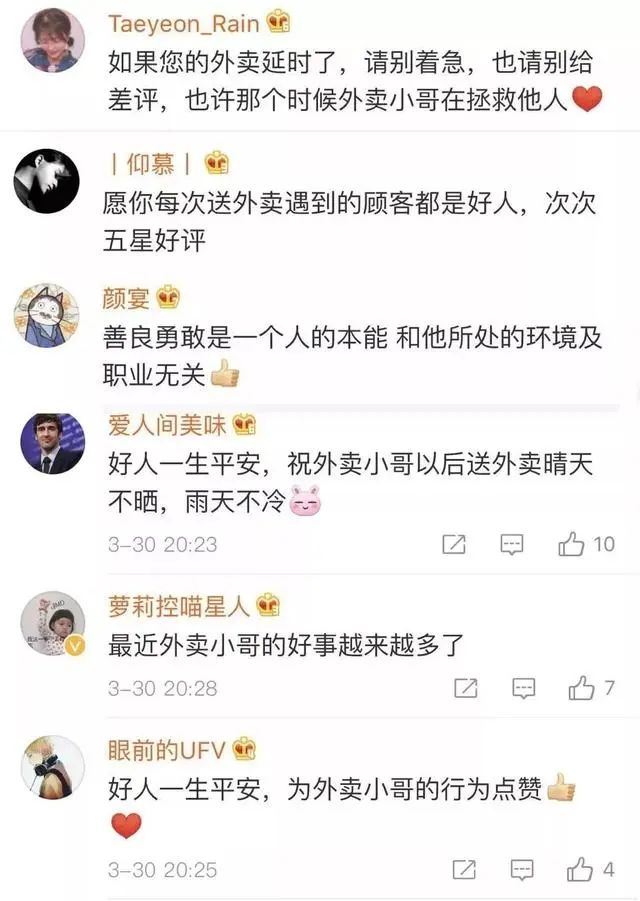 整個過程都被街頭監控拍下,並上傳到網上。《人民日報》微信公號給予頭條報道,網友們看到後很感動,於是有句話在網上飛速擴散:如果你點的外賣遲到了,請彆着急,因為給你送餐的外賣小哥,可能正在救人。