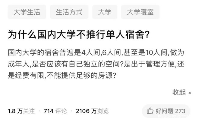在知乎上,就有個熱門問題“為什麼國內大學不推行單人宿舍”,這個問題獲得1.8萬個關注,2100多萬次瀏覽。