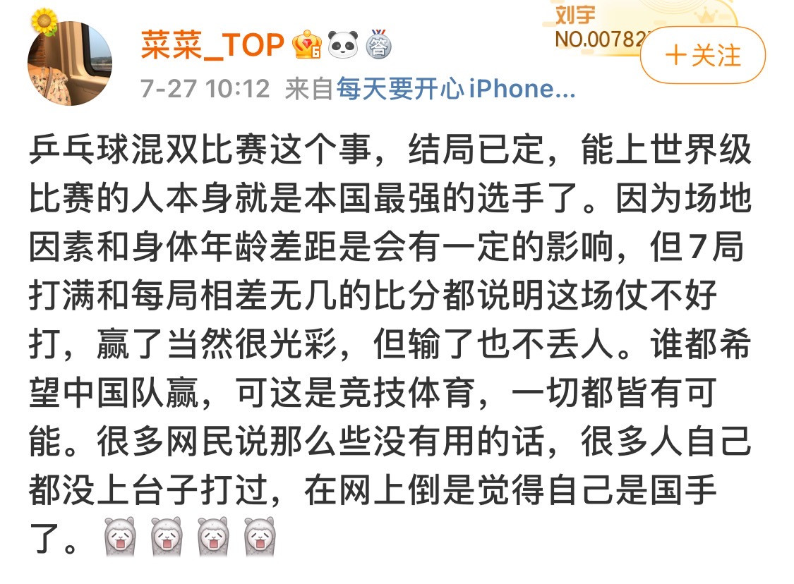 並且客觀地分析了此次比賽的結果,對那些無腦噴國乒運動員的網友表示不可理喻。