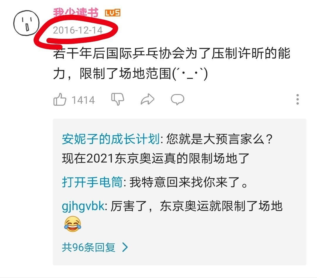 非常戲劇性的是,早在2016年,就有網友預言:國際乒協為了壓制許昕的能力,限制了場地範圍。不得不説,這位網友人不如其名啊,還是讀書多,説的話都成真了。