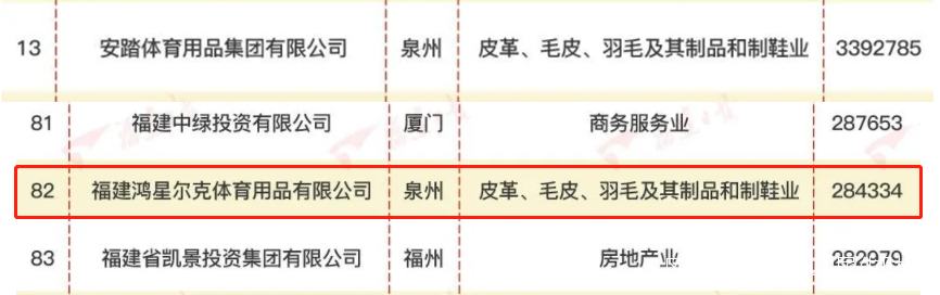 據福建省工商業聯合會發佈的2020年福建省民營企業100強榜單,鴻星爾克排名82位,營業收入為28.43億元;同在榜單的安踏體育排名13位,營業收入為339.28億元。