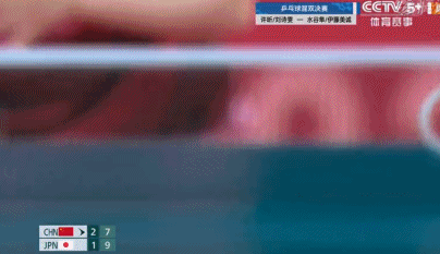 7-9許昕發球,水谷撇直線,劉詩雯起下旋到伊藤反手,伊藤靠了一個直線,許昕側身沒有位置,只能用反面捲了一個旋轉,被水谷隼發力反拉。
