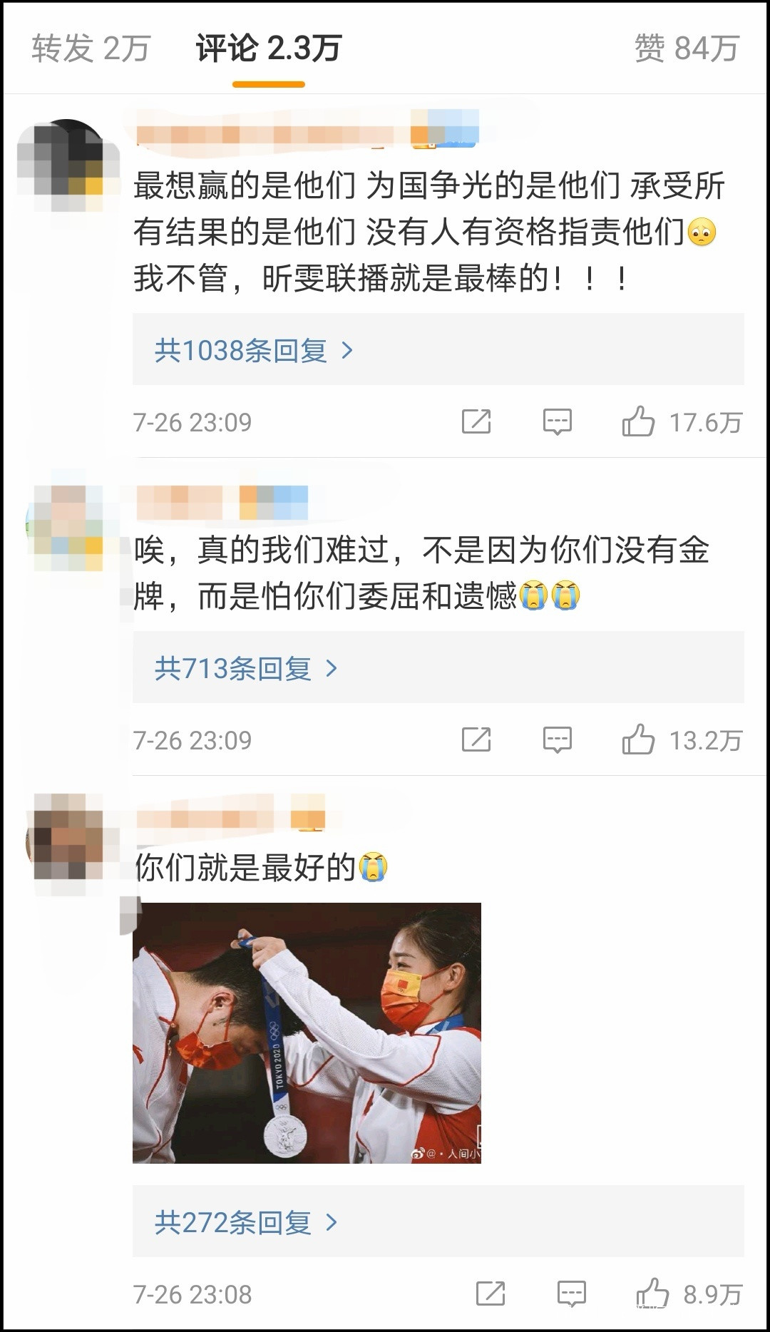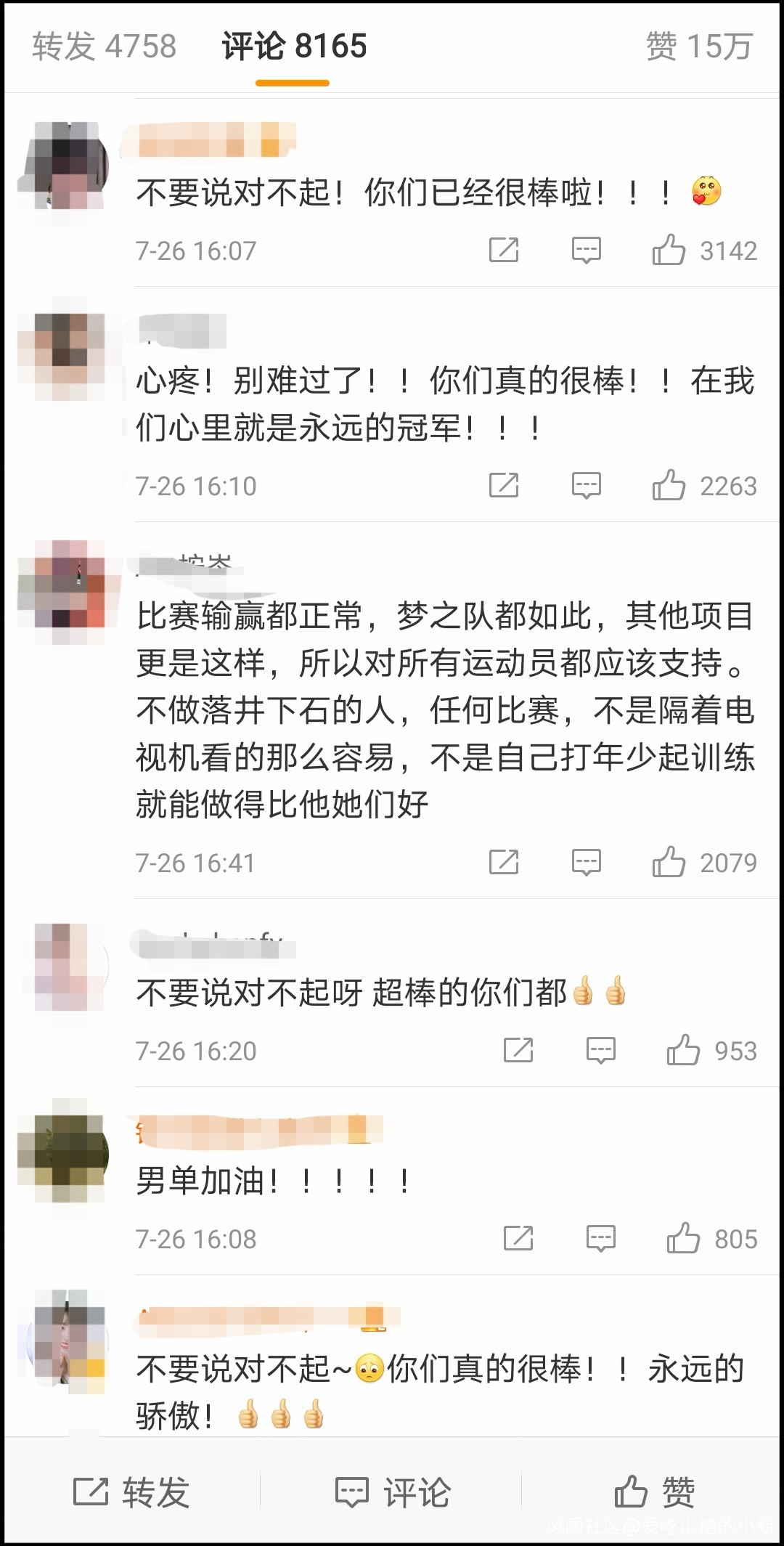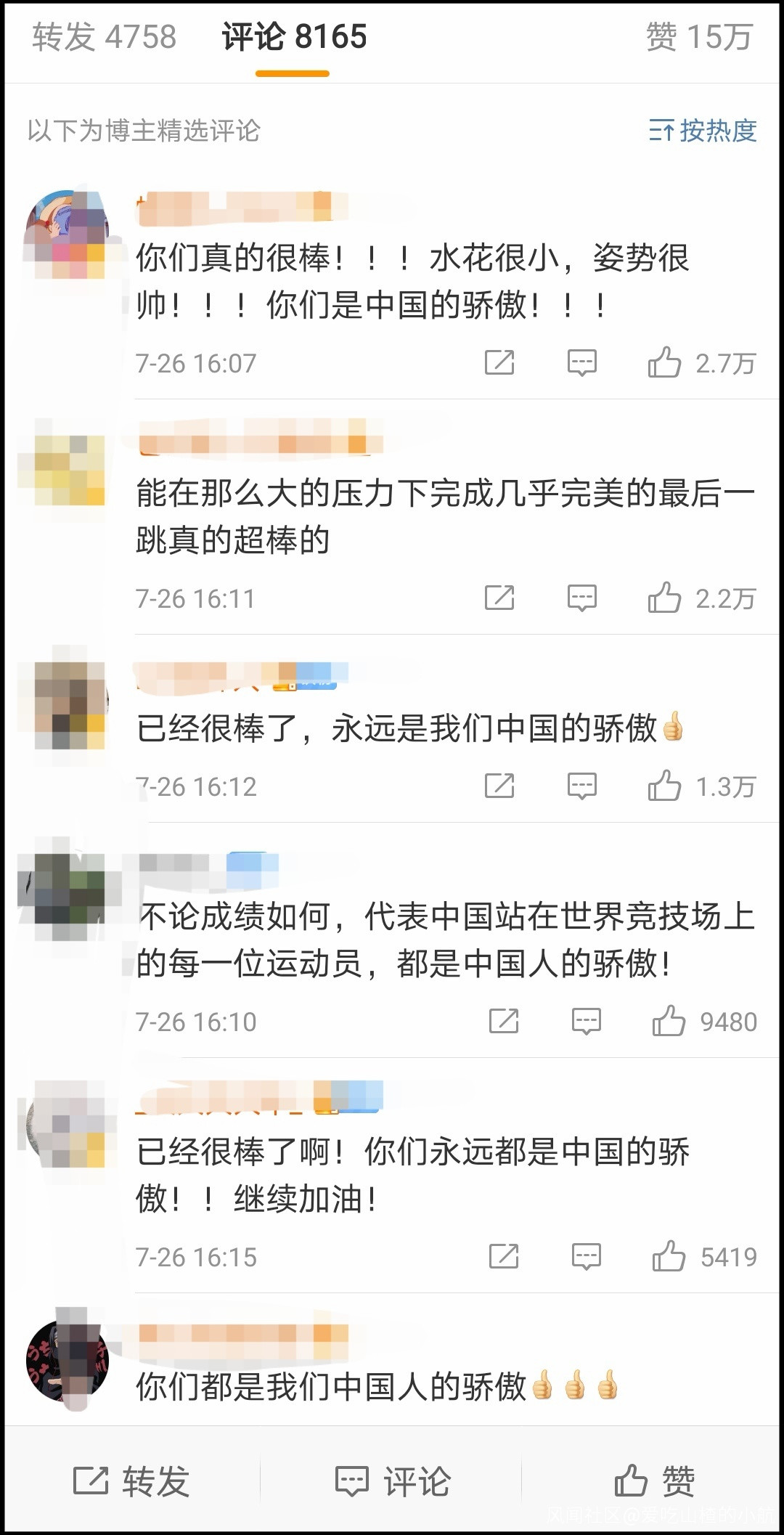 讓我感到暖心的,是不管有沒有取得很好的成績,每個身披國旗出征的運動員下的微博評論充滿着鼓勵與支持。
