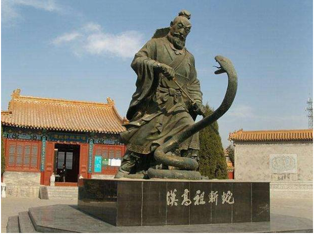 漢高祖斬蛇的故事是後人編撰的。《史記·封禪書》中用心記錄下一段劉邦的“黑色幽默”,説的是戰國末期騶衍之徒(騶衍,五行説的創始人)編織出秦代周是以水德代火德的新理論,秦始皇聽了就宣佈自己是黑(水)帝。然後,漢高祖入關,不知道黑帝是秦人的天帝,只聽説秦祠四帝,即白青黃赤帝四祠,馬上説,“吾聞天有五帝,而有四,何也?……吾知之矣,乃待我而具五也”。就這樣,劉邦莫名其妙地做了和秦始皇一樣的黑(水)帝。