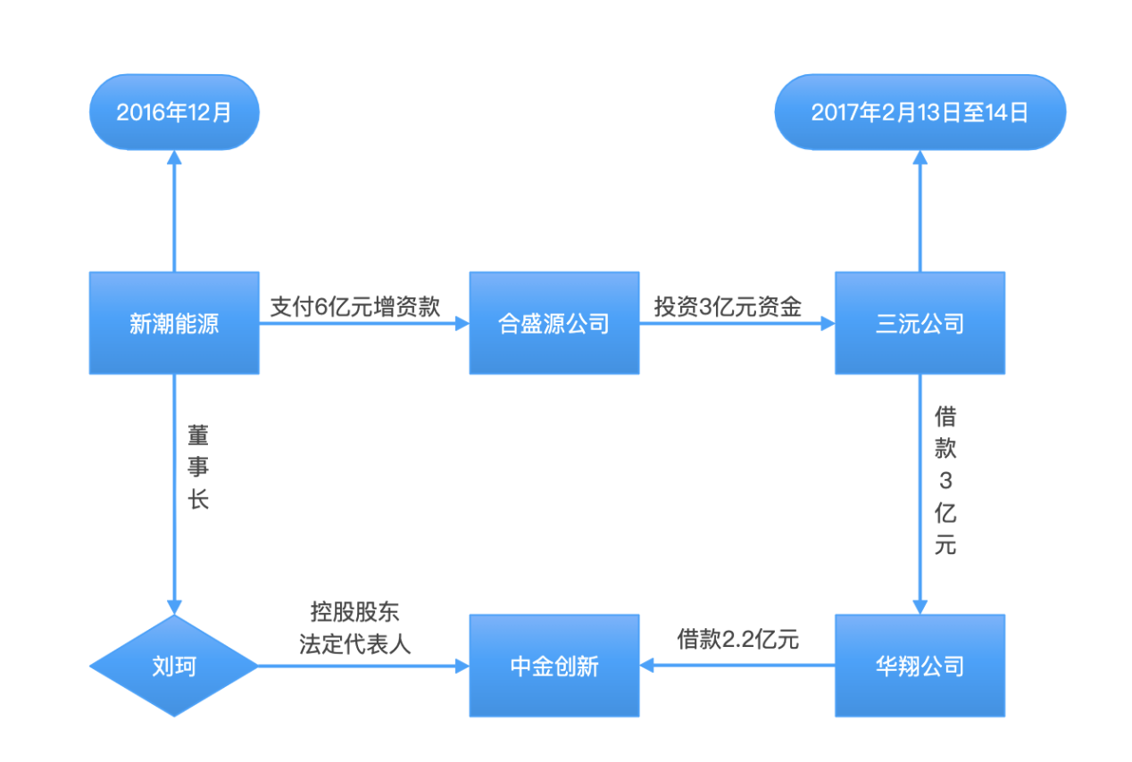 2017年2月13日至14日,三沅公司向華翔(北京)投資有限公司(下稱“華翔公司”)匯入3億元借款,收到借款後,華翔公司又向劉珂控制下的中金創新(北京)資產管理有限公司(下稱“中金創新”)匯入2.2億元借款。