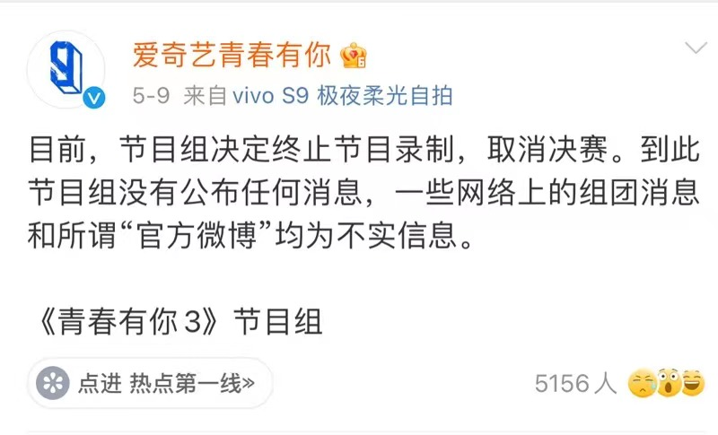 愛奇藝《青春有你3》(以下簡稱《青3》)深陷“倒奶”風波,央視、新華社等多家官媒的下場批評。5月9日,隨着@愛奇藝青春有你官微發佈聲明後,《青3》徹底按下暫停鍵。《青3》成為史上首個沒有決賽、沒有成團夜的選秀綜藝。