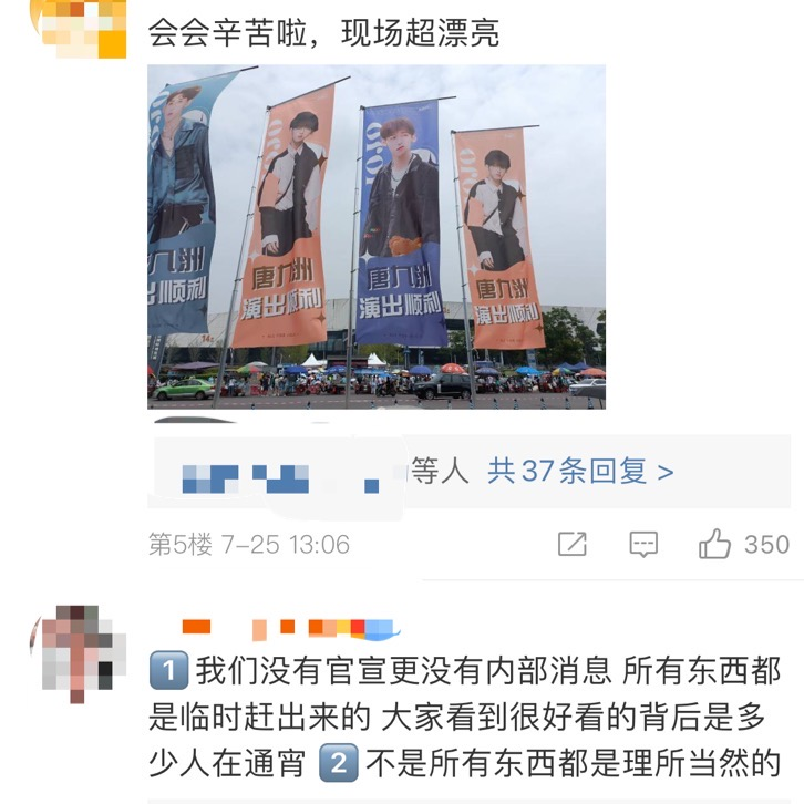 接下來,就是各家粉絲的應援戰場了。“從知道確定的那天晚上開始,連夜趕印應援物。羅一舟家是23號開始準備大型應援物;唐九洲家以為是和之前樂華演唱會差不多規模,剛開始準備並不多,後來24號凌晨連夜加印。”“連淮偉和孫亦航兩家準備比較就,陣仗比較大,再就是羅一舟家應援也很多,唐九洲和孫瀅皓兩家都來了廣告車。”按照兩位的現場描述,雖是突然成團,但現場應援堪比成團夜。