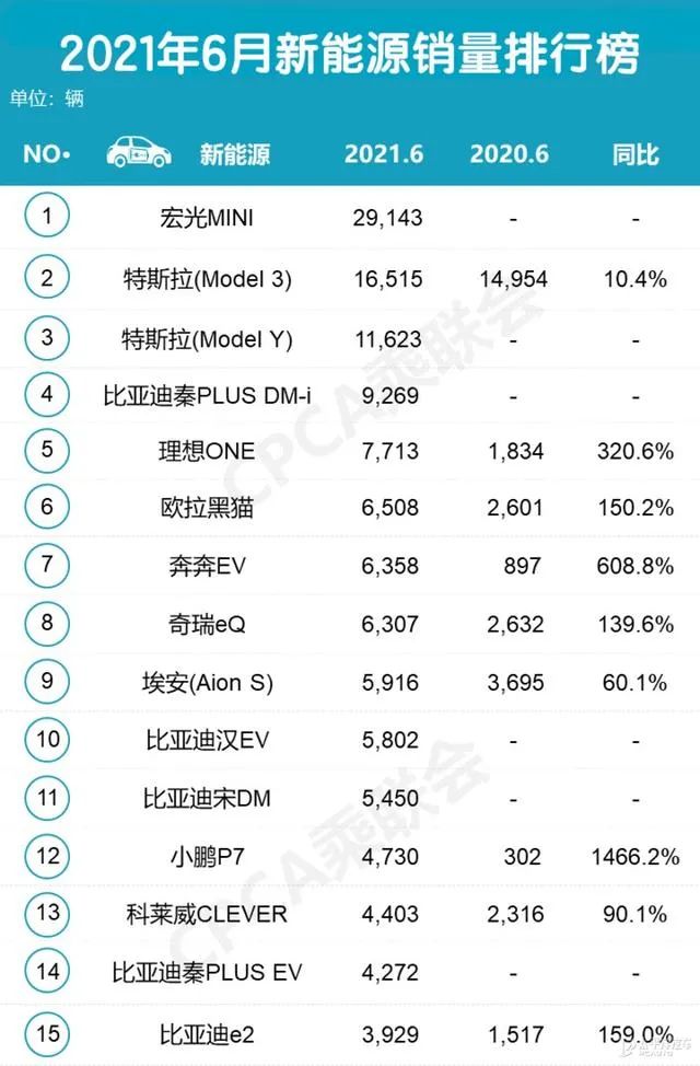 在乘聯會2021年6月新能源銷量排行榜中,特斯拉Model 3和Model Y兩款車型分別以16515輛以及11623輛,排在第二和第三。
