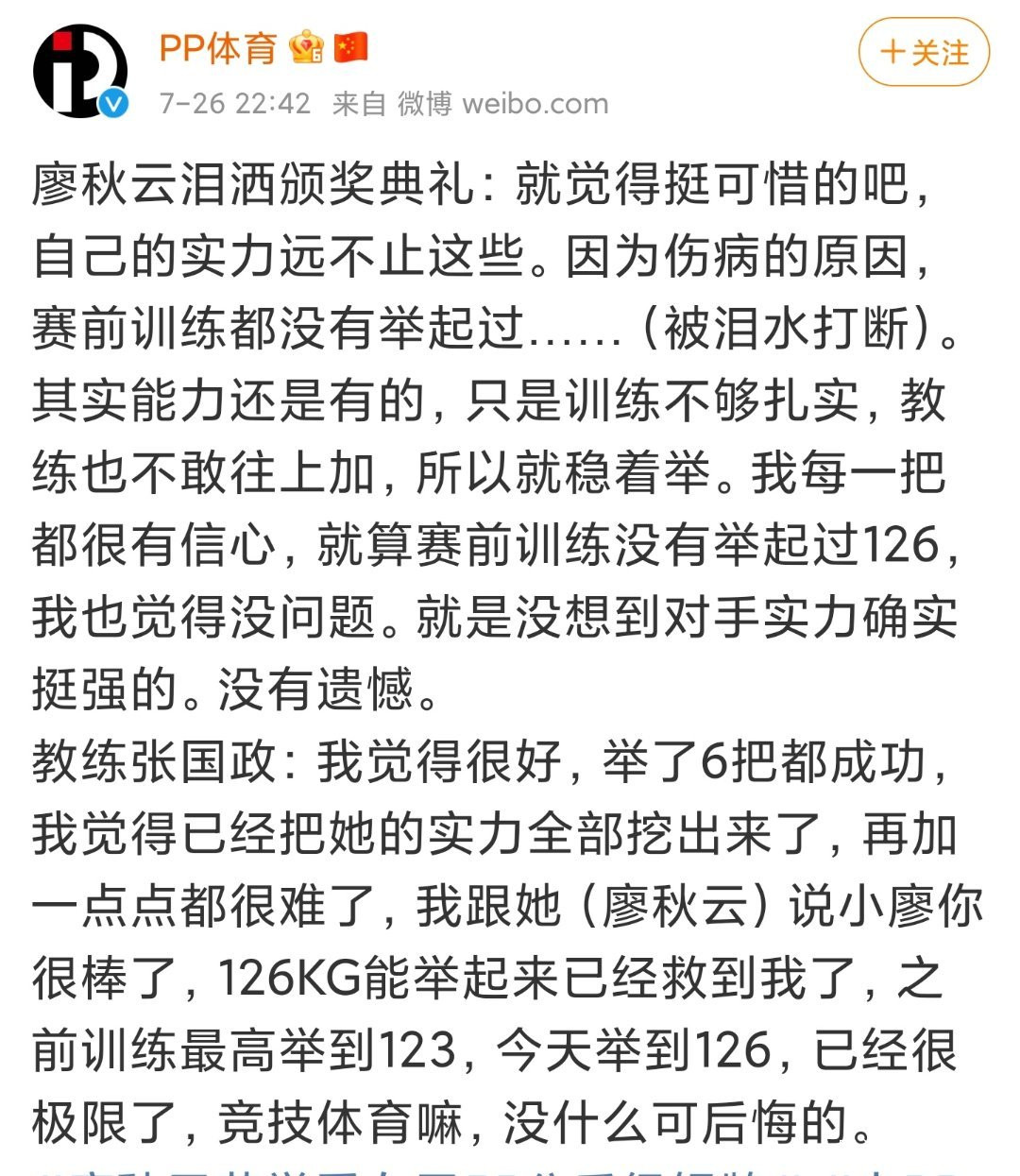6. 教練主要是信息失誤,想穩保,開118就是保牌,123覺得是訓練水平夠了,對手124後,又覺得126夠了。其實很簡單,夠不夠看對手,如果對手舉不起來才是夠,所以應該堅決壓對手一公斤報。一個風險是對手報高把自己也帶高完不成,如果是這樣,自己沒實力舉不起來輸了也沒話説。廖顯然是有實力的。從118開始,比對手先上場就是失誤。123也是一個失誤,可以改125,但是已經有風險了。總之姑娘輸的很不服氣。
