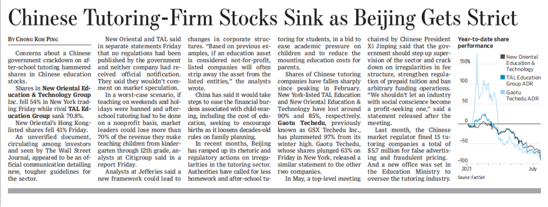 多家海外媒體也對此事件表示了高度關注,其中華爾街知名投行(Jefferies)分析師表示,新的市場環境可能導致教育培訓類公司結構發生變化。“根據過往案例,如果教育資產被認為是“非盈利”時,上市公司可能會從上市實體中剝離該資產。”