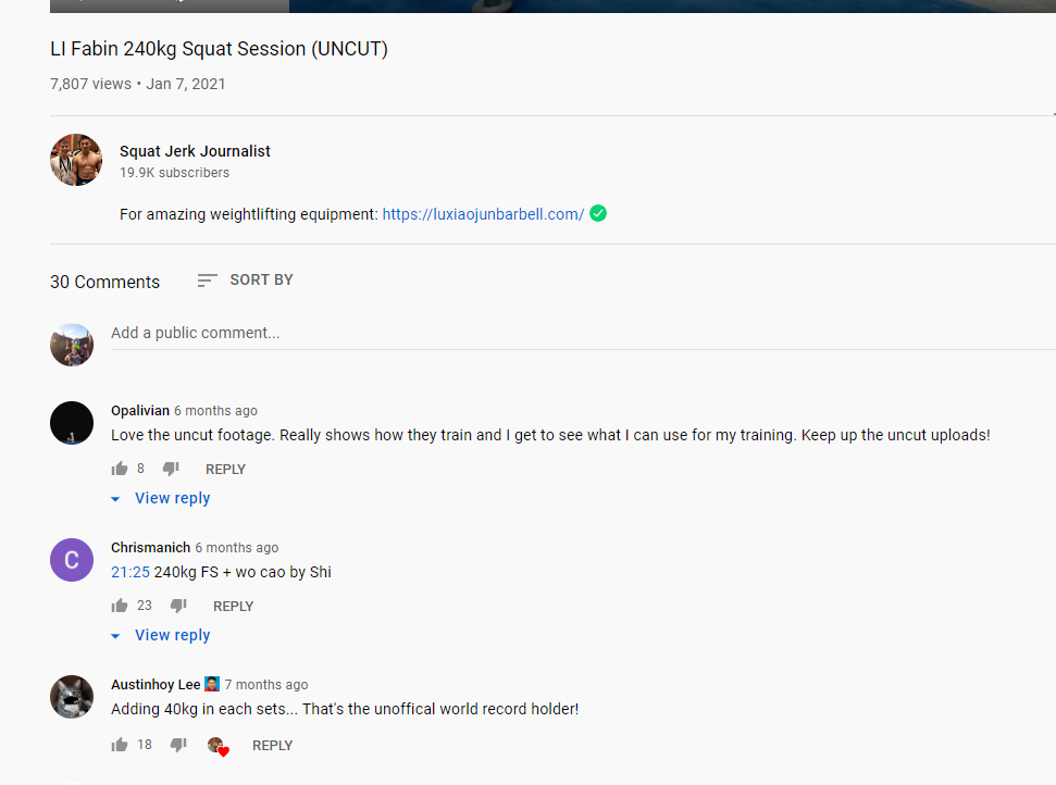 比如一段展示李發彬如何訓練的視頻,下面除了試圖學習他訓練方法的力量舉愛好者,就是吹他牛逼的外國人。