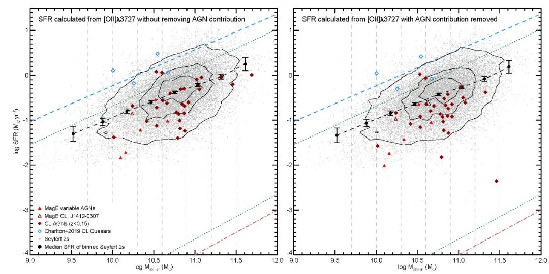 圖1. 星系的SFR--Mgal診斷圖(恆星形成率--星系質量)。相比較於近鄰Seyfert星系總體,變臉Seyfert以及大變幅Seyfert的宿主星系位於SFR低端(普遍位於圖中黑色折線以下)。另外,較高光度的變臉類星體的宿主星系位於綠谷地帶之上,處於恆星形成主序帶。(取自Liu+2021ApJ的圖7)