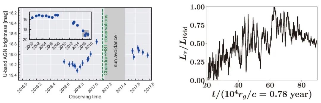 圖2. 左:一個典型的變臉Seyfert星系的光變曲線,呈現出久期緩變的特徵(Mrk1018;取自文獻Krumpe et al. 2017, A&A 607,L9的圖1)。右:數值模擬的CLQ/EVQ的光變曲線,大變幅只是光變幅度的連續分佈的高端(取自文獻Jiang & Blaes 2020, ApJ 900,25的圖14)。