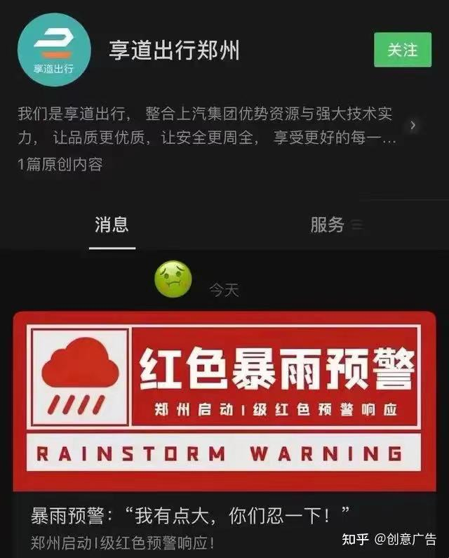 7月20日,享道出行鄭州在他們的官方公眾號上推送紅色暴雨預警的消息。本來推送紅色暴雨預警是沒有錯的,但他們錯就錯在配文寫着:“我有點大,你們忍一下”。