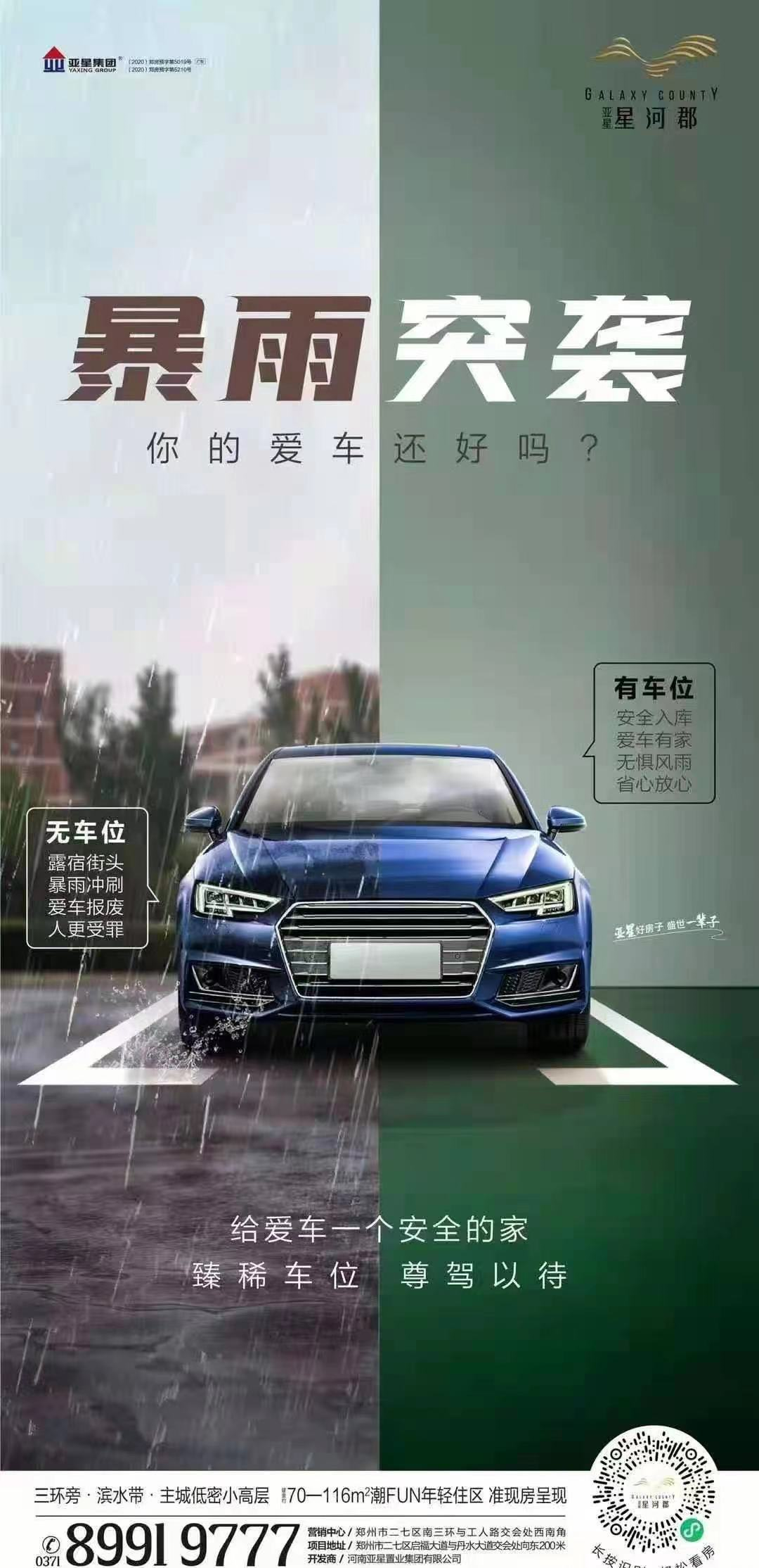 還有亞星集團同樣是為了營銷自己的車位,海報的廣告語為**“暴雨突襲,你的愛車還好嗎”**,背景為汽車室內外的對比圖,並稱無車位“露宿街頭、暴雨沖刷、愛車報廢、人更受罪”。