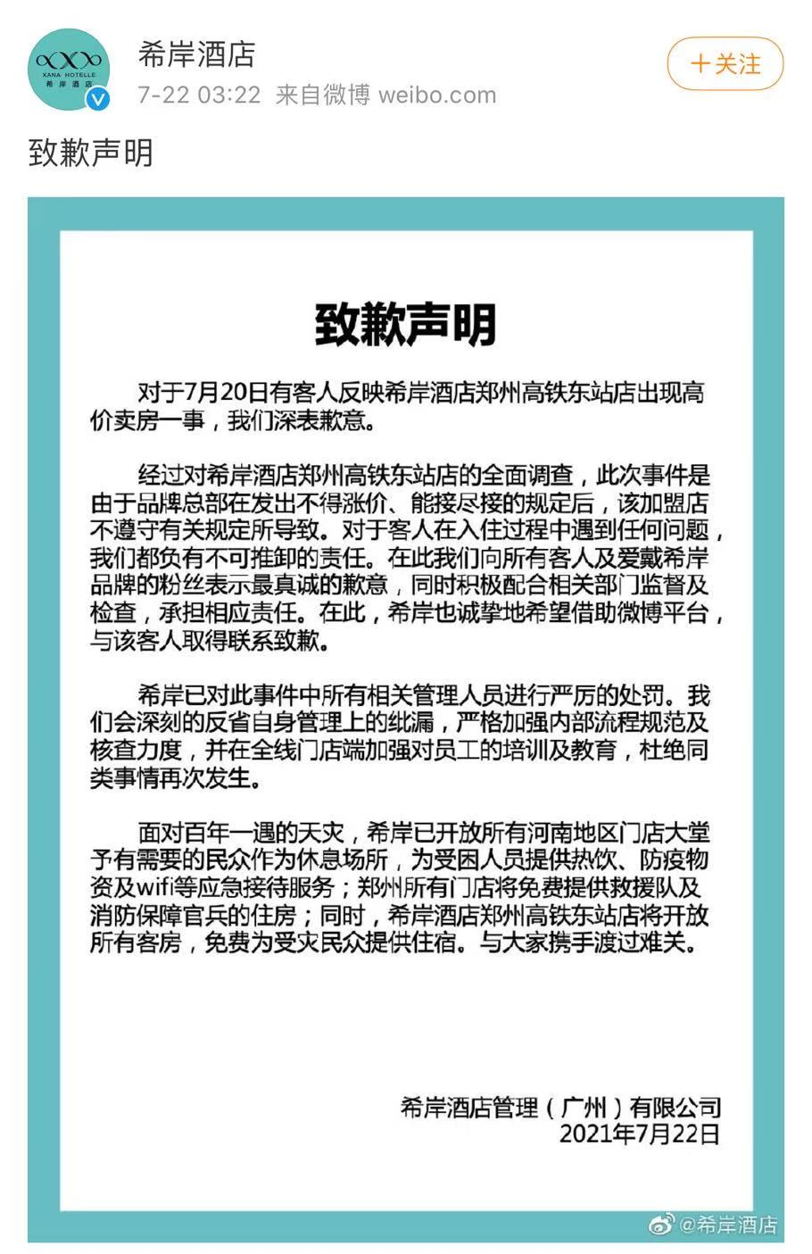而被處罰的希岸酒店立刻發出了致歉聲明表示是加盟店不遵守有關規定所導致,以後會加強管理,杜絕類似的事情再次發生。並表示希岸酒店高鐵站店將開放所有客房,免費為受災民眾提供住宿。