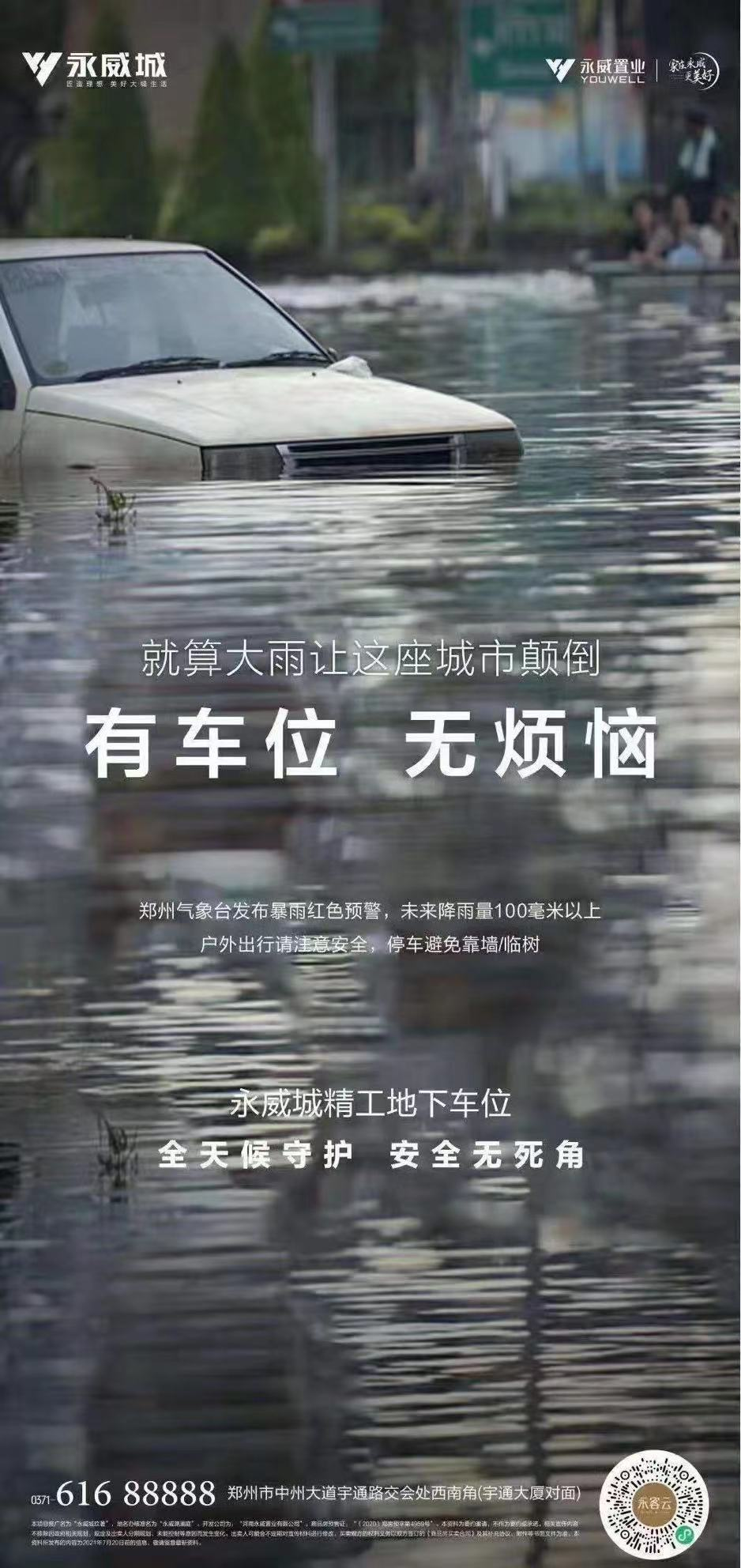 河南鄭州永威置業發佈了一張海報,上面寫着:“就算大雨讓整座城市顛倒,有車位,無煩惱”,海報的背景是一輛被泡在城市暴雨中的車。