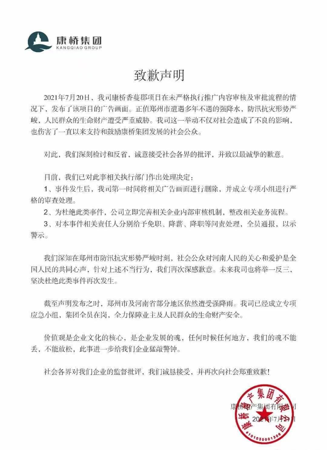 7月21日,成為網友們口誅筆伐對象的康橋集團發佈了道歉聲明,表示公司此次的營銷不僅對社會造成了不良的影響,也傷害了一直以來支持和鼓勵康橋集團發展的社會羣眾。對此作出深刻的檢討和鄭重致歉,並接受社會各界的批評。
