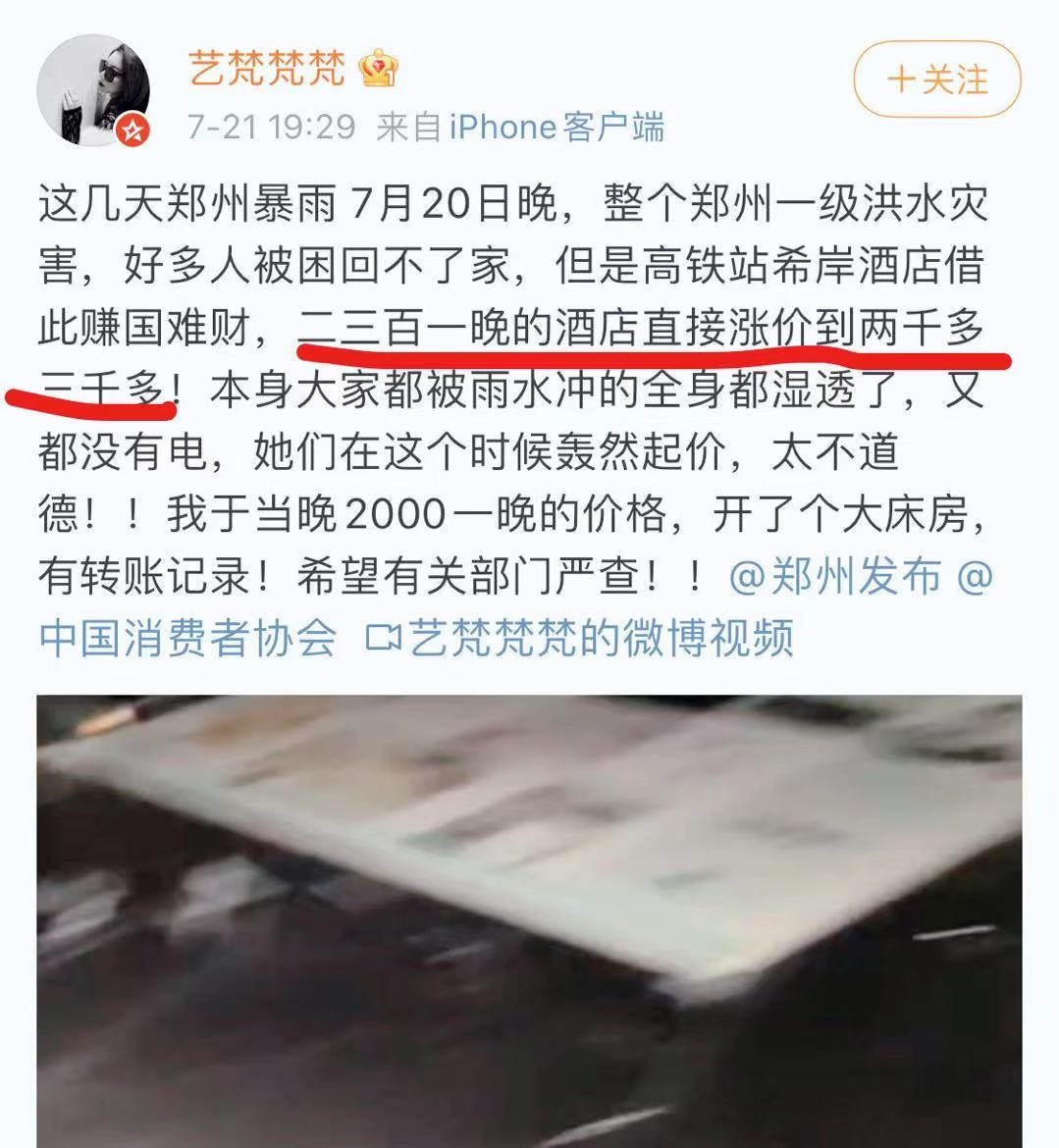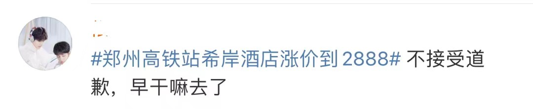 7月21日晚,一網友在網上爆料,在許多人因為災情無法回家、被雨水淋的全身濕透的時候,高鐵站的希岸酒店卻坐地起價,**原本二三百一晚的房間直接漲價到兩千多、三千多。**並且該網友表示,在無可奈何的情況下自己當晚以2000塊錢的價格開了一個大牀房。
