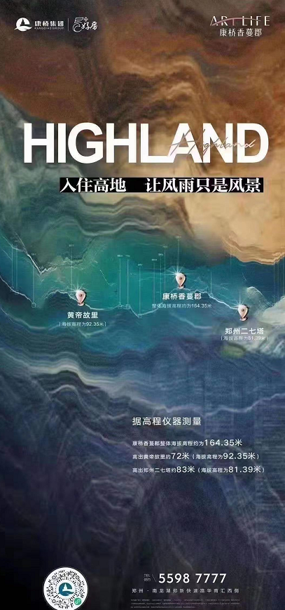 還有更離譜的是康橋集團,一張將暴雨災情圖做成的海報,上面寫着:“入住高地,讓風雨只是風景”,還煞有介事的表示自家樓盤比黃帝故里高出72米,比鄭州二七塔高出83米。